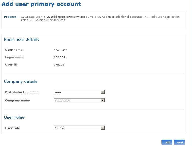 The Add primary account screen is used to assign primary account and role to the user. This is a mandatory step in the create user process. CAM, eCAM and company users can be assigned only a company as their primary account. DAM should only be assigned a distributor as his primary account.