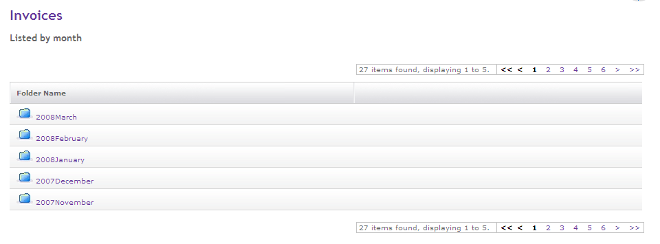 The Folder List page allows you to select the month for which you would like to see the invoices.